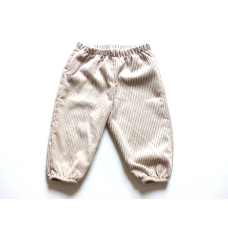 Pantalon de création française en excellent état. En velours côtelé de couleur beige, ceinture ajustable.