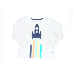Haut de marque OBAIBI, en très bon état, animation colorée sur fond gris chiné.