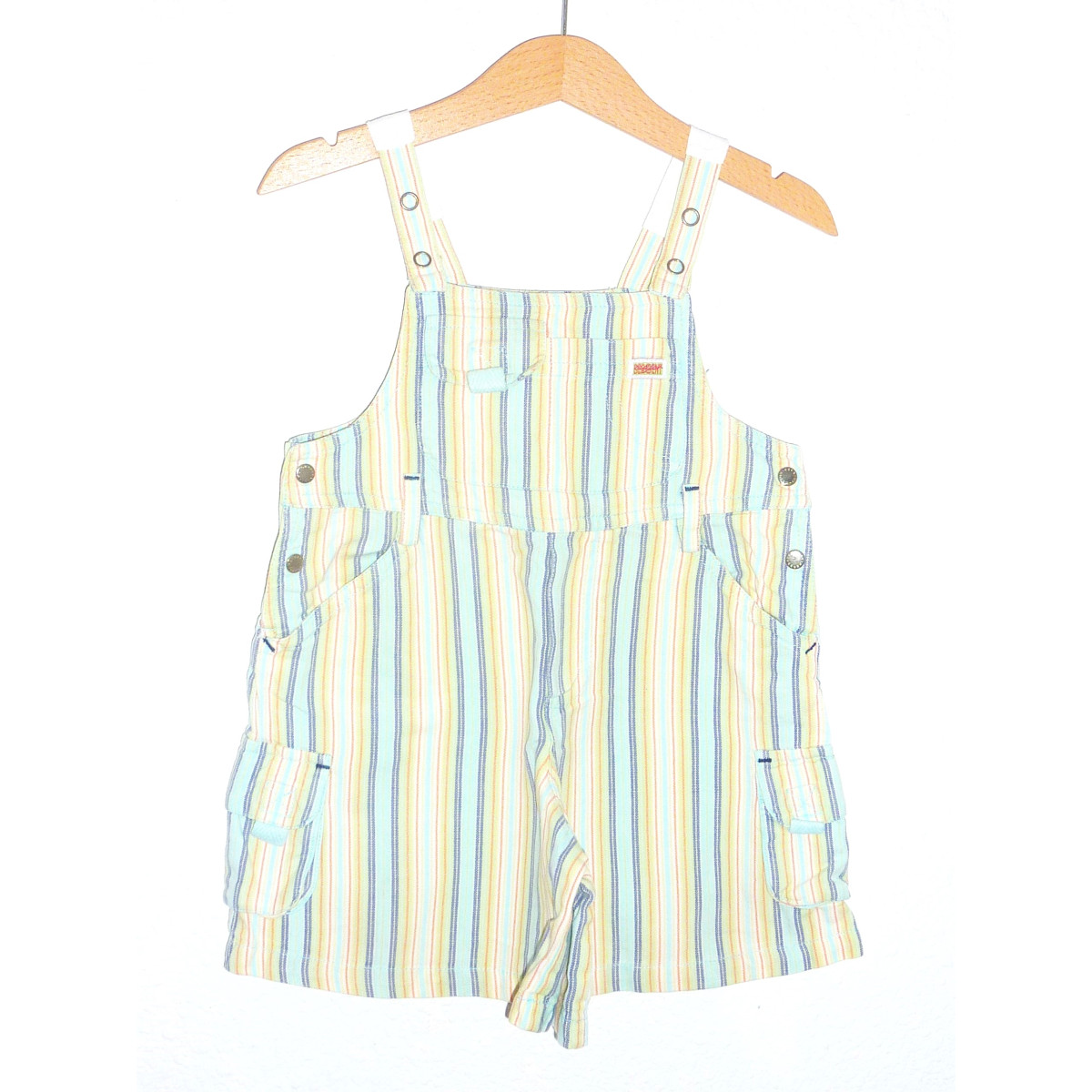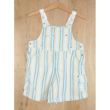 Salopette courte vintage en état excellent ornée de petites poches sur les côtés. Rayures de couleur pastel (turquoise/menthe/jaune) sur fond crème.