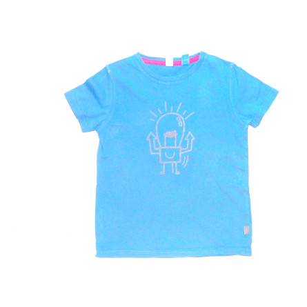 Tee shirt de marque OKAIDI en très bon état, motif gris sur fond bleu.