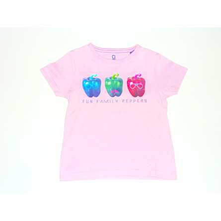 Tee shirt de marque OKAIDI en très bon état, motif coloré sur fond rose.