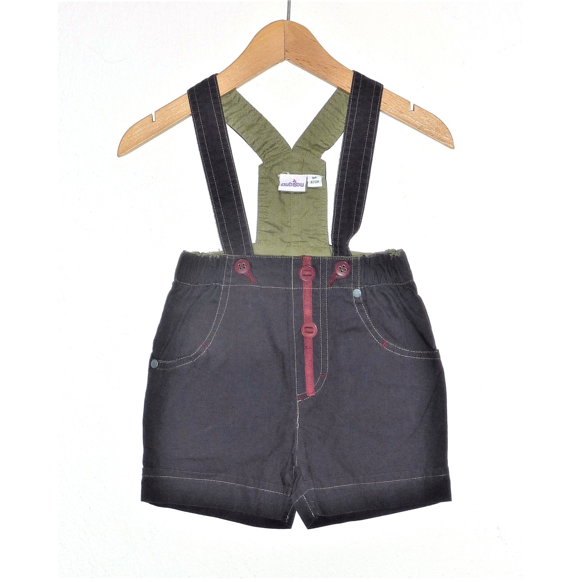 Short de marque AUBISOU noir, détails couleur bordeaux, à bretelles, en excellent état. Style rétro chic pour votre bébé avec ce petit habit d'occasion.