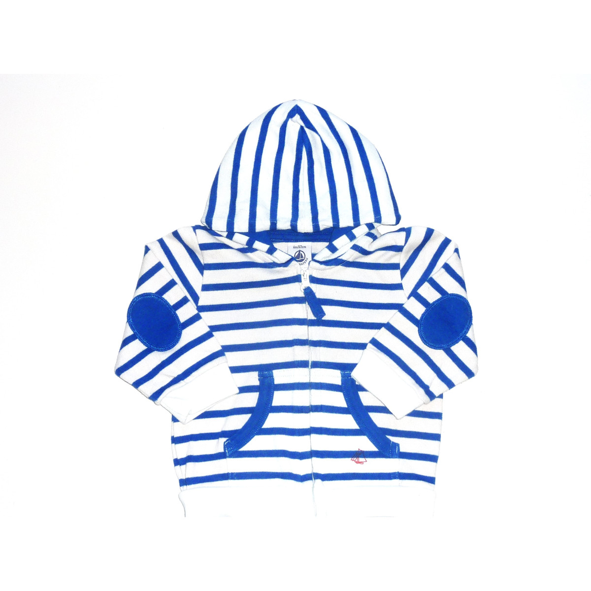 Gilet à capuche de marque PETIT BATEAU en état excellent, imprimé rayé bleu sur fond blanc. Fermeture zippée.