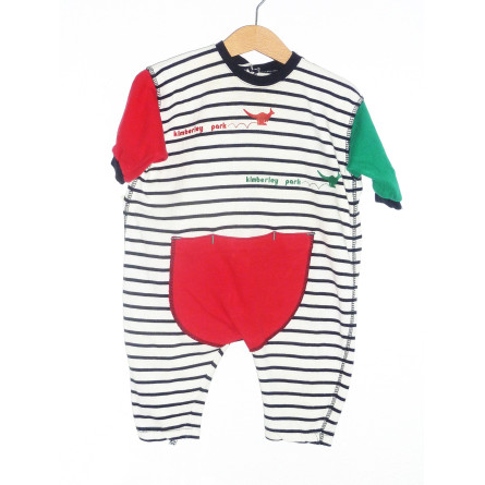 Combinaison vintage de marque JEAN BOURGET en état excellent, en coton, imprimé rayé sur fond crème, manches rouges et vertes.