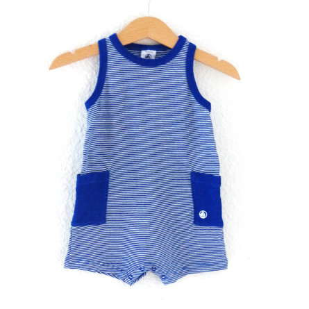 Barboteuse en coton de marque PETIT BATEAU en état excellent, imprimé rayé bleu sur fond crème.