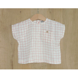 Blouse légère de marque BOUTCHOU à carreaux de couleur corail sur fond crème, état excellent. Un classique de la marque pour bébé chic !