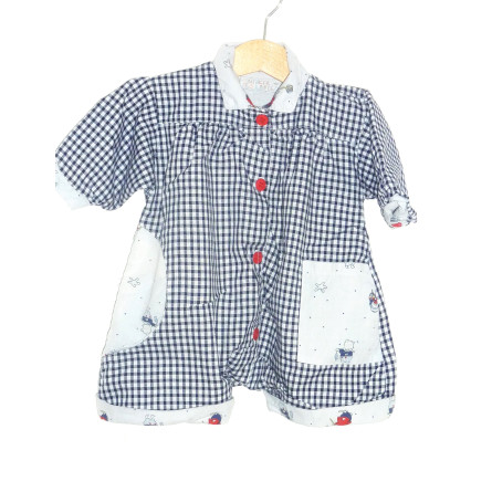 Barboteuse vintage en état excellent, en coton, imprimé vichy bleu, orné d'un col chic, ouverture boutonnée devant.