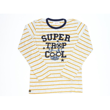 Haut de marque CATIMINI en excellent état. Gris chiné, orné de rayures de couleur moutarde et d'une inscription noire devant.