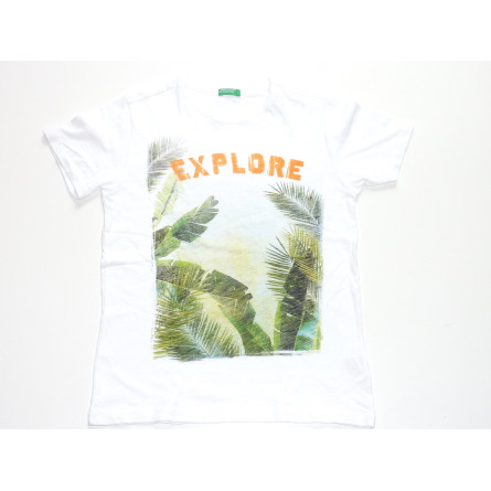 Tee shirt en excellent état de marque BENETTON blanc orné d'une animation verte et orange.