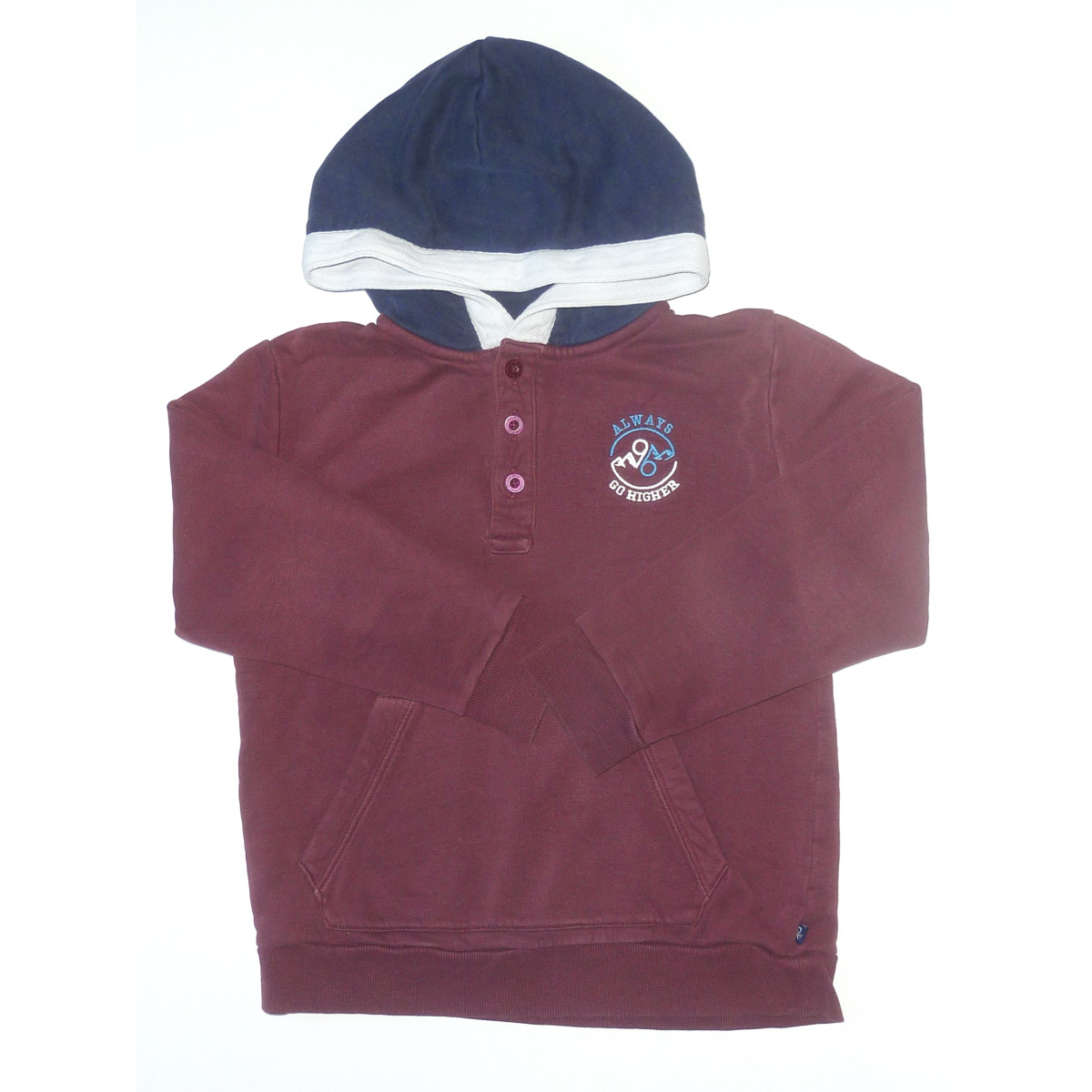 Sweat en état excellent de marque OKAIDI, à capuche, couleur prune, orné d'une poche kangourou et d'un petit motif.