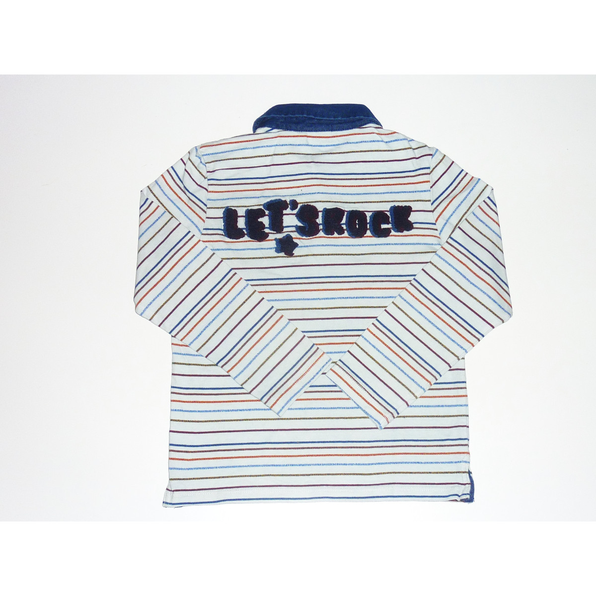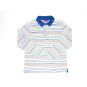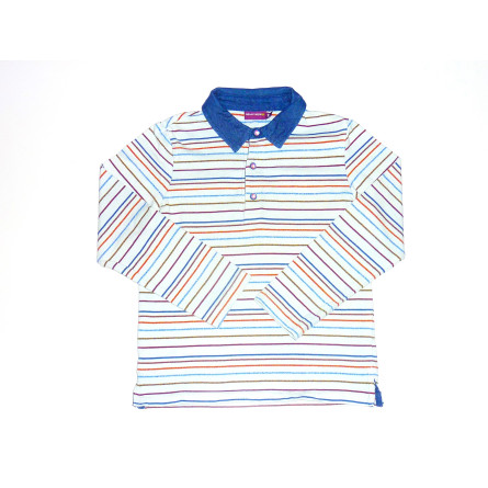 Polo en excellent état de marque SERGENT MAJOR, rayures colorées sur fond gris, orné d'un col denim bleu.
