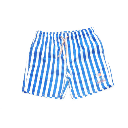 Short de bain de marque VERT BAUDET, en excellent état, rayures bleues sur fond blanc.