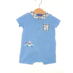 Barboteuse en coton, en maille piquée, en état excellent, couleur bleue outremer, ornée d'un col chic à carreaux et d'une petite poche.