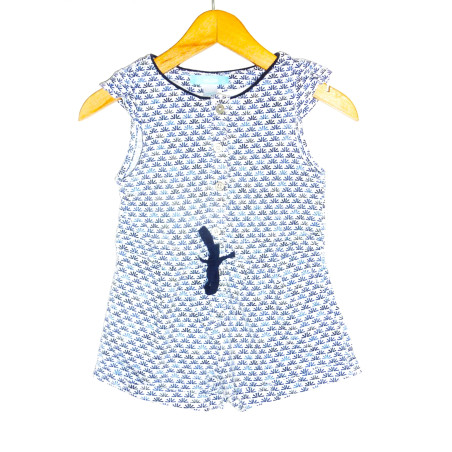 Salopette courte en excellent état de marque OBAIBI imprimé bleu sur fond blanc.