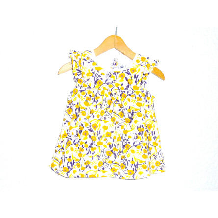 Top volanté de marque Petit Bateau en excellent état, imprimé fleuri jaune et violet sur fond blanc.