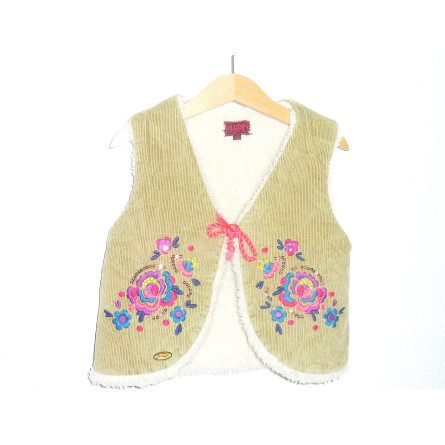 Veste sans manche, en état excellent, en velours côtelé, doublée fourrure, ornée de broderies fleuries.