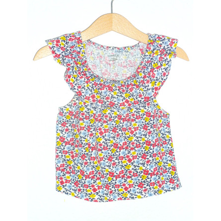 Blouse volantée de marque MONOPRIX en excellent état. Imprimé fleuri multicolore sur fond blanc. En coton bio.