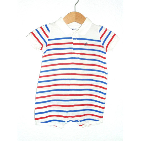 Barboteuse en très bon état, de marque PETIT BATEAU, imprimé rayé bleu et rouge.