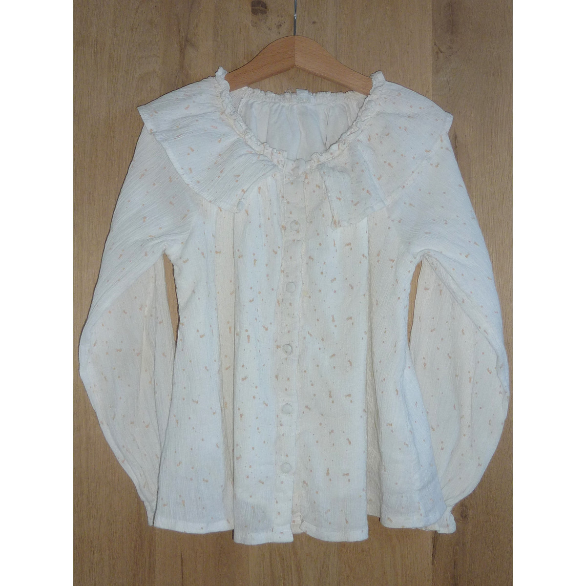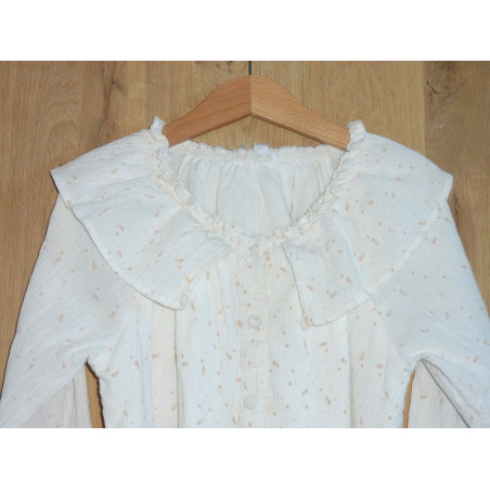 Blouse de marque Vert Baudet en excellent état, doublée, imprimé beige sur fond crème, ornée d'un col volanté.