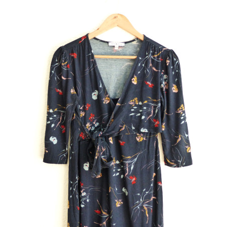 Une robe qui sublimera vos formes et vous accompagnera tout au long de votre grossesse. De marque made in France ENVIE DE FRAISE, imprimé fleuri sur fond couleur marine; Idéale allaitement grâce à son pan de tissu caché.
