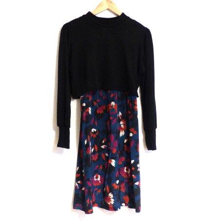 Une robe qui sublimera vos formes et vous accompagnera tout au long de votre grossesse. De marque made in France ENVIE DE FRAISE, imprimé fleuri couleur prune sur fond bleu; Idéale allaitement grâce à son pull noir au dessus qui se soulève.