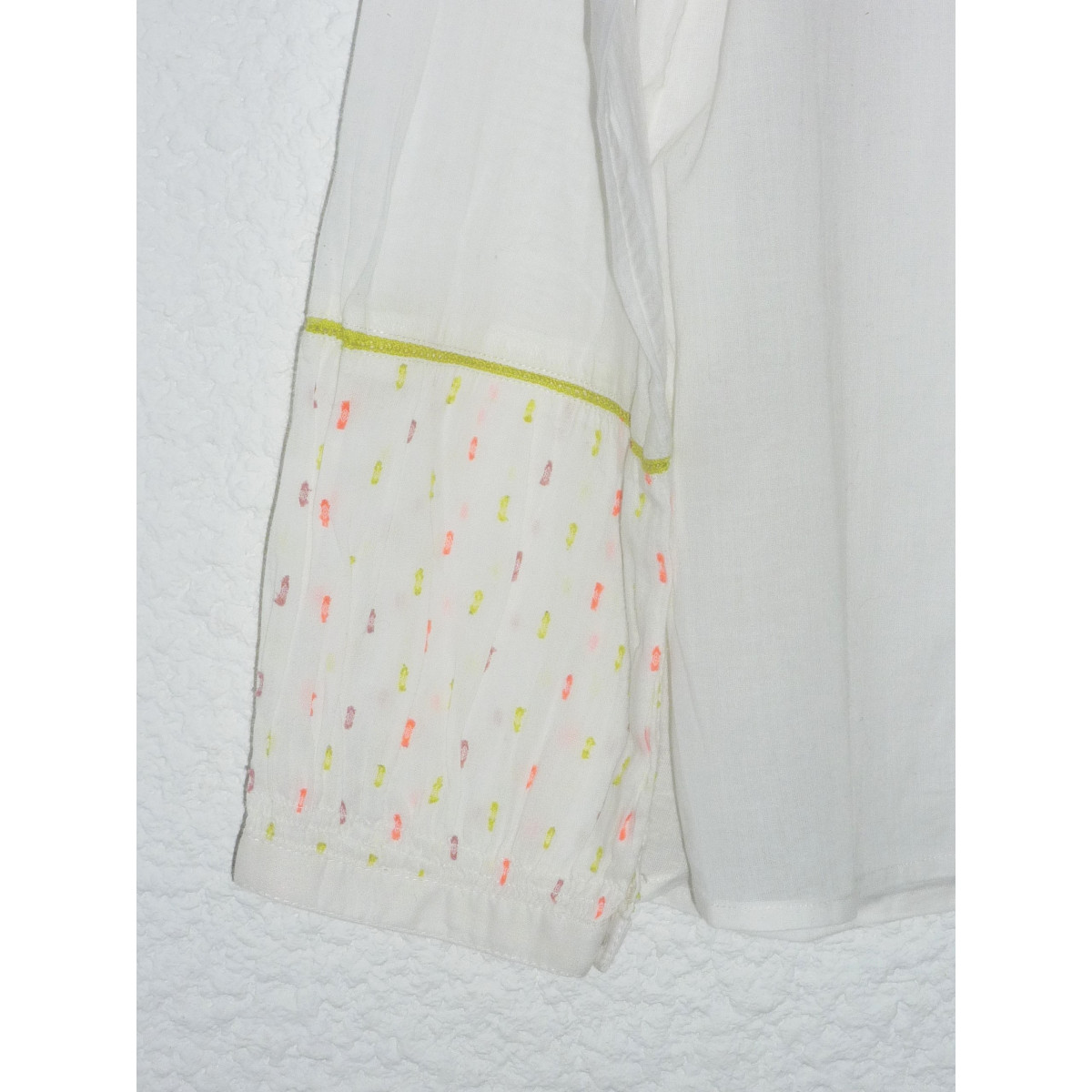 Blouse légère à manches longues de la grande marque SCOTCH and SODA en état excellent, blanche, à plumetis corail et anis, liseré brodé anis.