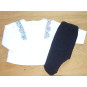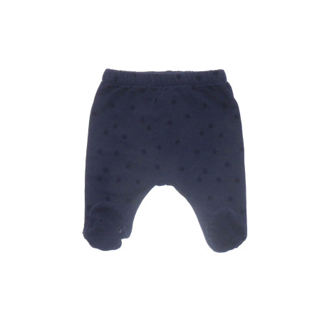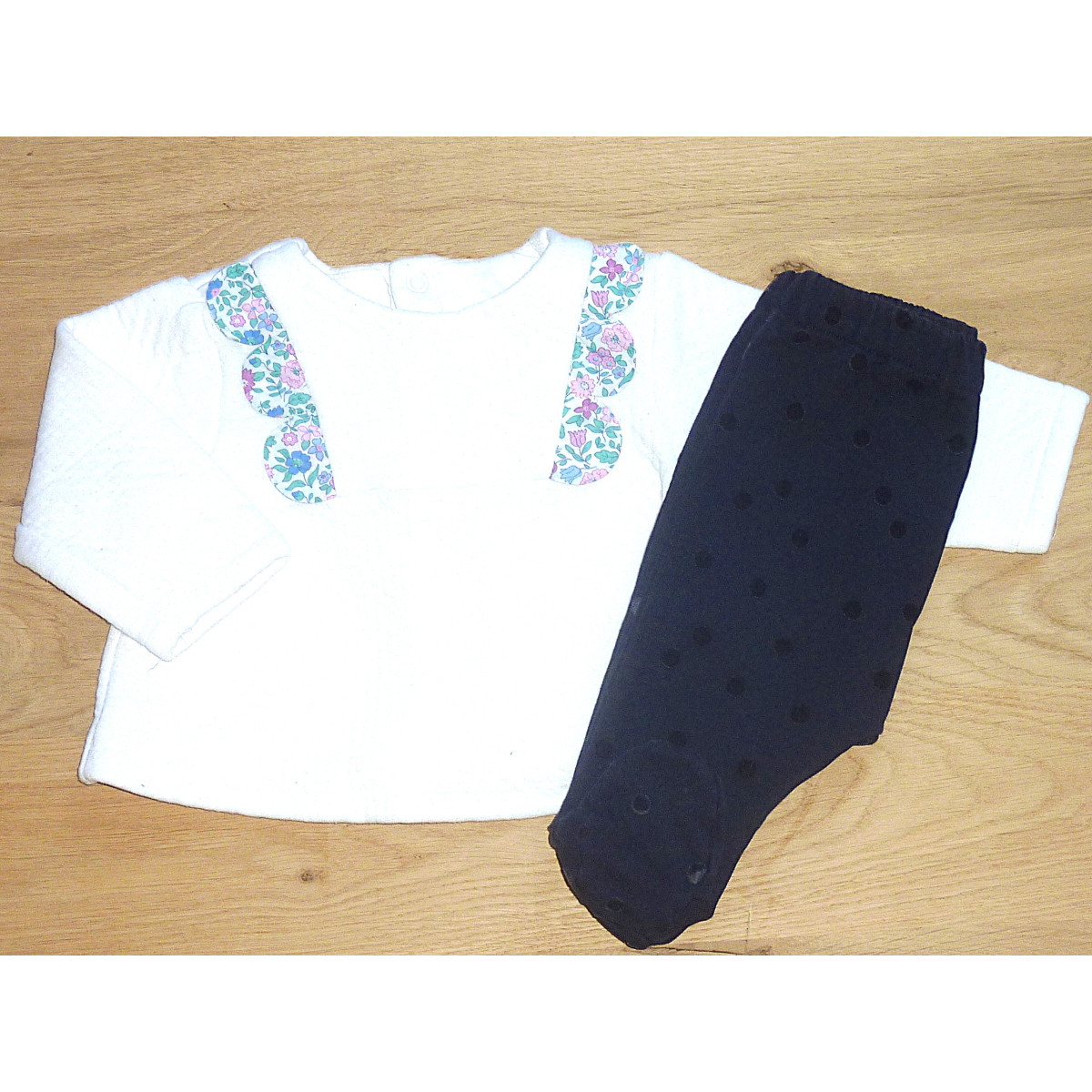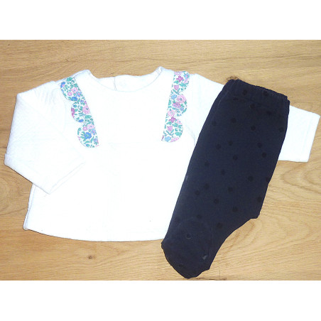 Ensemble ne parfait état de marque JACDI, composé d'un sarouel marine à pois, ceinture élastique, associé au sweat en molleton blanc orné d'un liseré liberty.