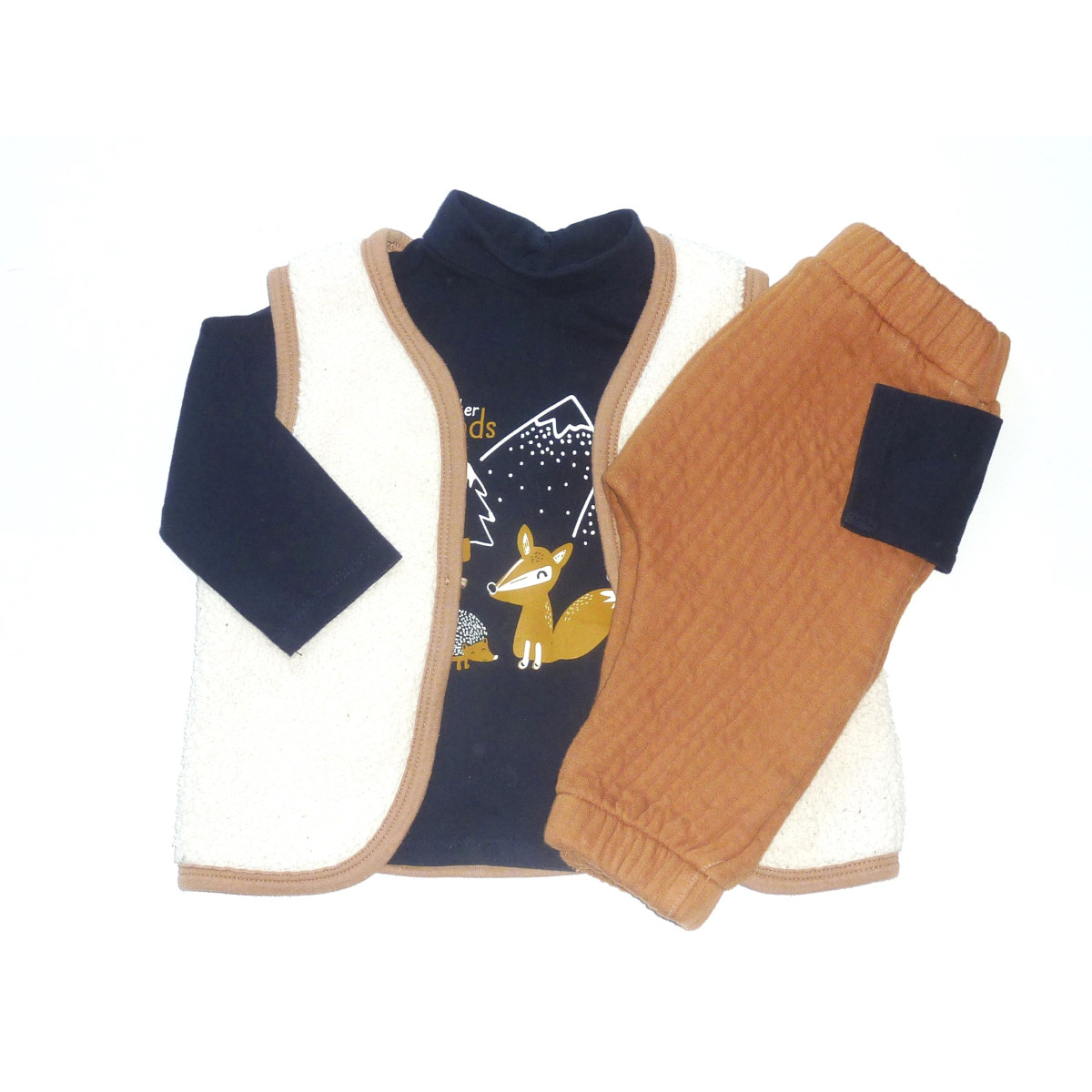 Ensemble mixte en état excellent composé du sarouel en molleton couleur camel, ceinture élastique, du haut Kiabi à col montant fermé par pressions et du gilet moutonné.