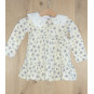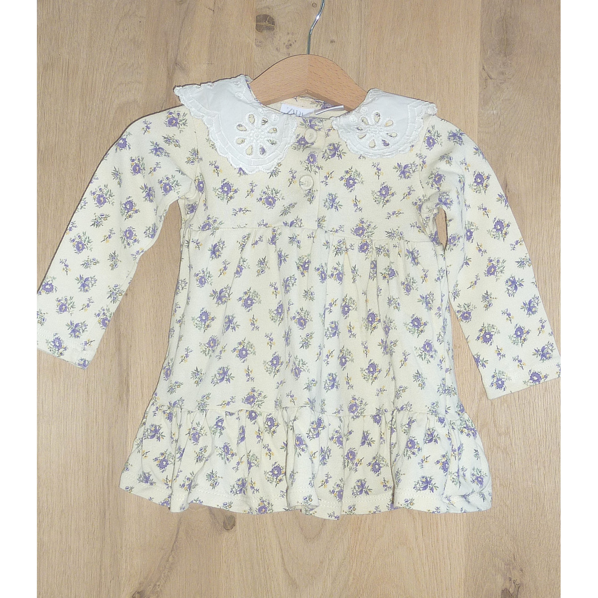 Robe en état excellent, de marque ZARA, imprimé fleuri violet et vert sur fond beige, ornée d'un petit col brodé.