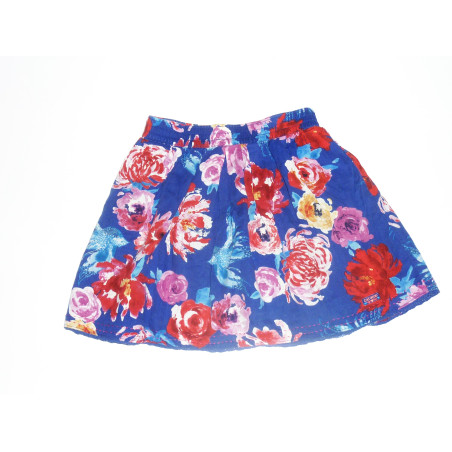 Jupe doublée de marque CATIMINI en excellent état, ceinture élastique, imprimé fleuri rose et rouge sur fond bleu.