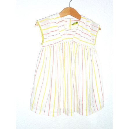 Robe de marque TAO, imprimé rayé jaune et corail sur fond crème. On aime ses jolies finitions sur les manches. Etat excellent.