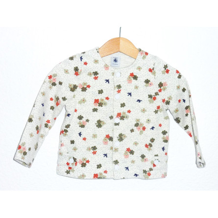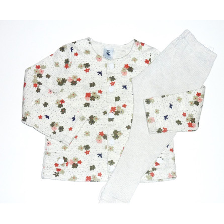Ensemble en excellent état de marque PETIT BATEAU, 100% coton, composé d'un legging côtelé et du gilet assorti, imprimé fleuri sur fond gris.