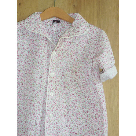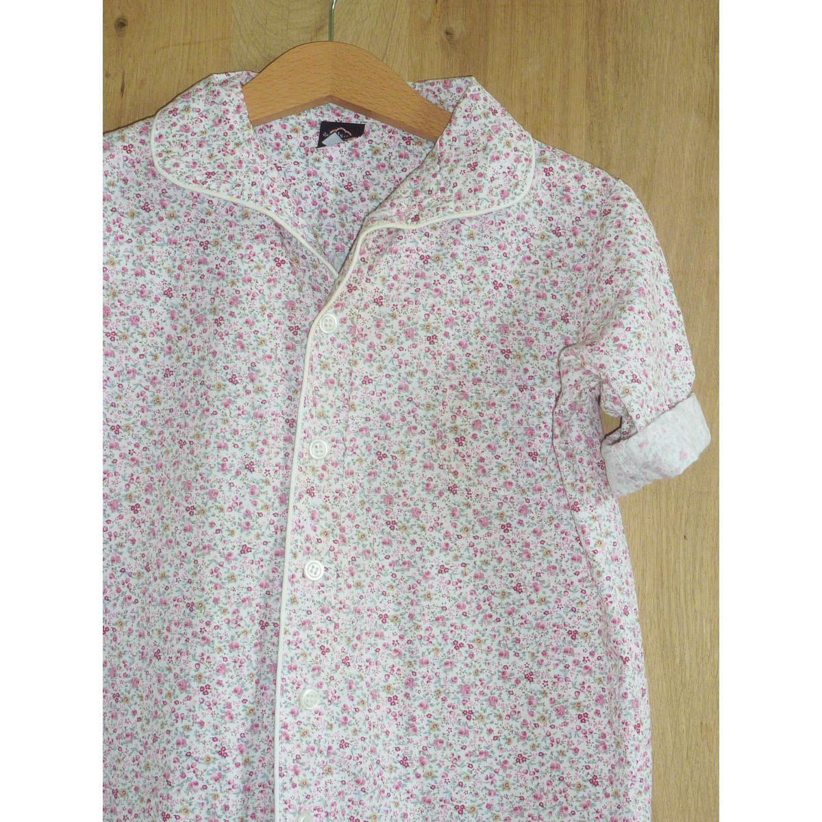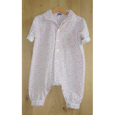 Pyjama vintage en coton, en état excellent. Imprimé fleuri rose avec pointes de vert sur fond blanc.