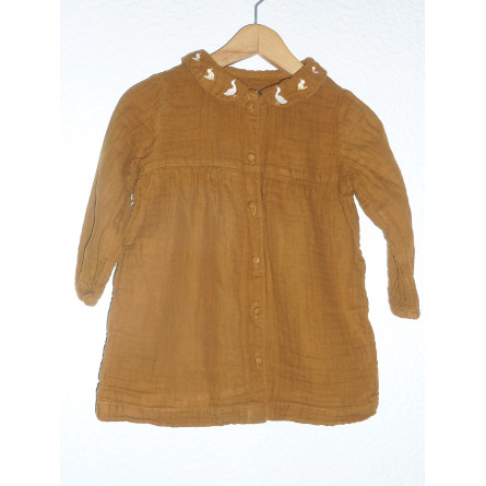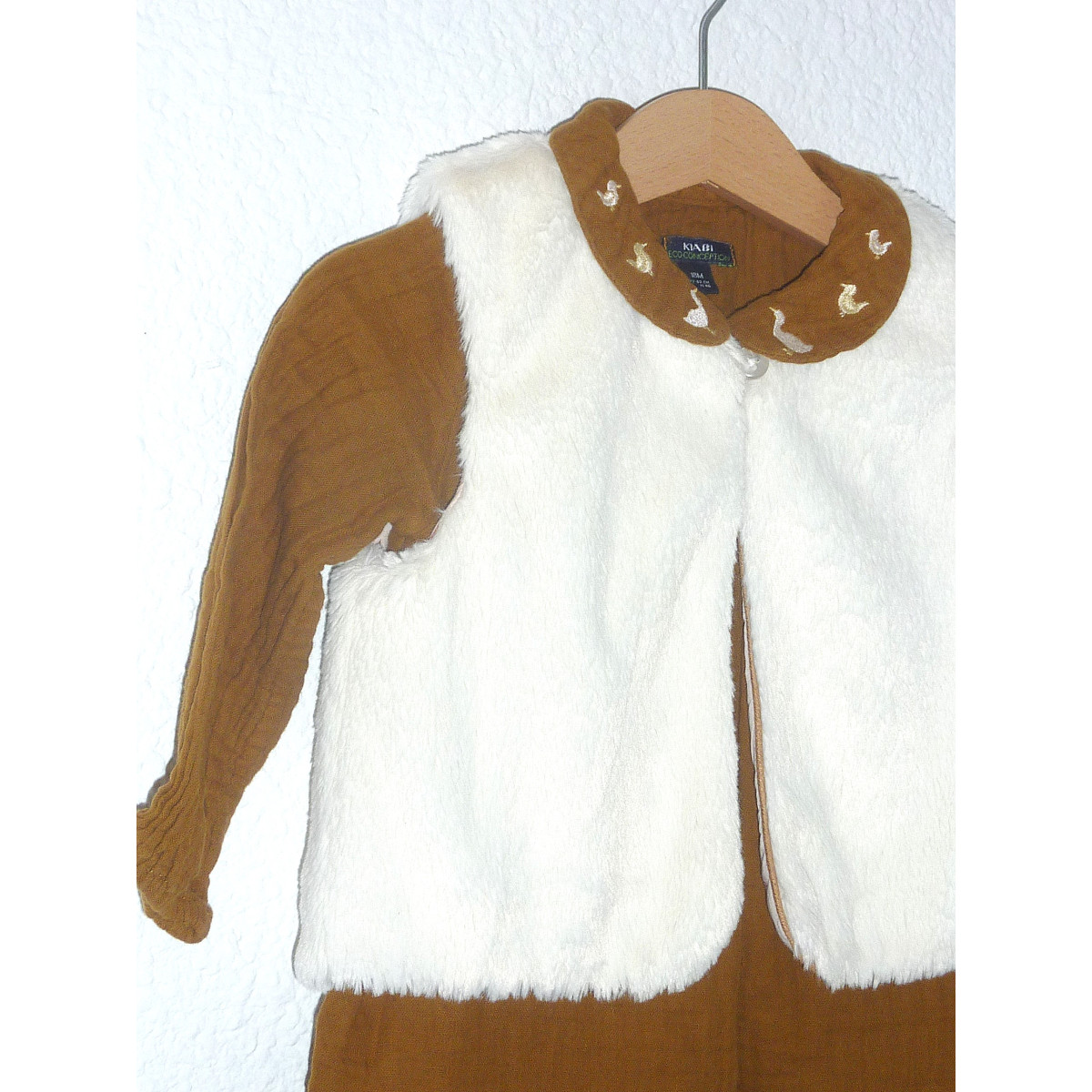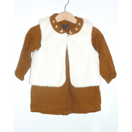 Ensemble de marque KIABI en état excellent composé d'une robe en gaze de coton couleur caramel, fermeture boutonnée devant, ornée d'un col brodé et d'un gilet couleur crème en fausse fourrure tout doux.