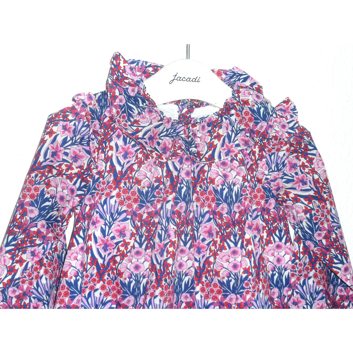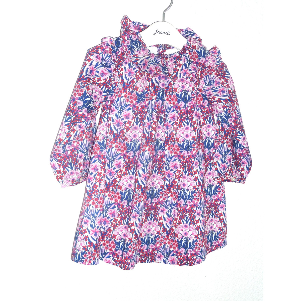Robe doublée de marque JACADI en état excellent, en état neuf, imprimé fleuri fushia/bleu/rouge. Fermeture par boutons dans le dos.