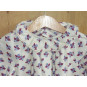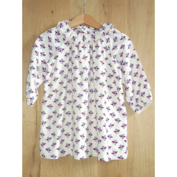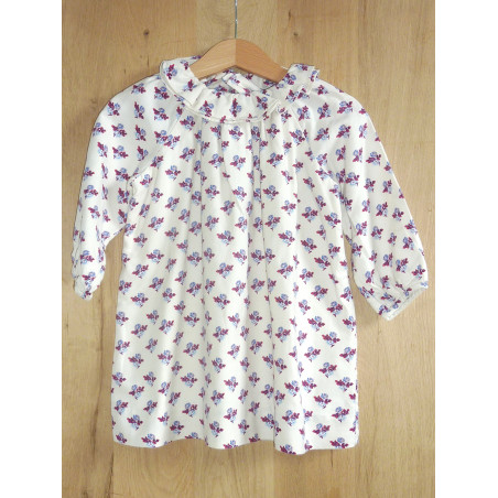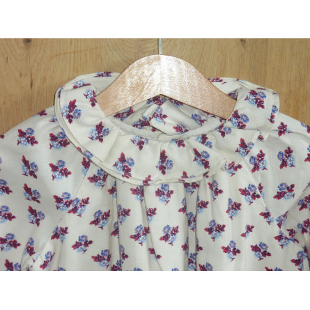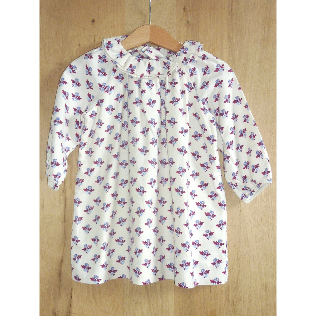 Robe doublée de marque BONPOINT en état excellent, en état neuf, imprimé fleuri bordeaux et bleu sur fond crème. Fermeture par boutons dans le dos.