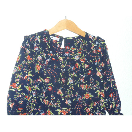 Robe en état excellent de marque NAF NAF, imprimé fleuri coloré sur fond marine, ornée d'un col volanté.