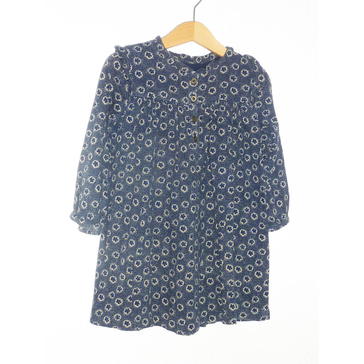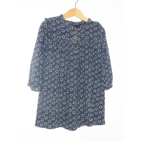 Robe en coton épais de marque BOUTCHOU en excellent état, imprimé fleuri beige sur fond couleur bleue nuit.