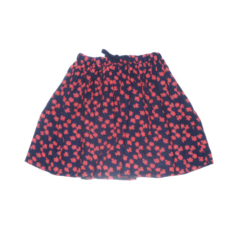 Jupe doublée, en état excellent, imprimé fleuri couleur rouge sur fond marine. Ceinture élastique.