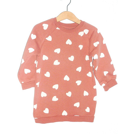 Robe en coton épais de marque VERT BAUDET en excellent état, imprimé à coeurs beiges sur fond couleur blush. Coupe sweat.