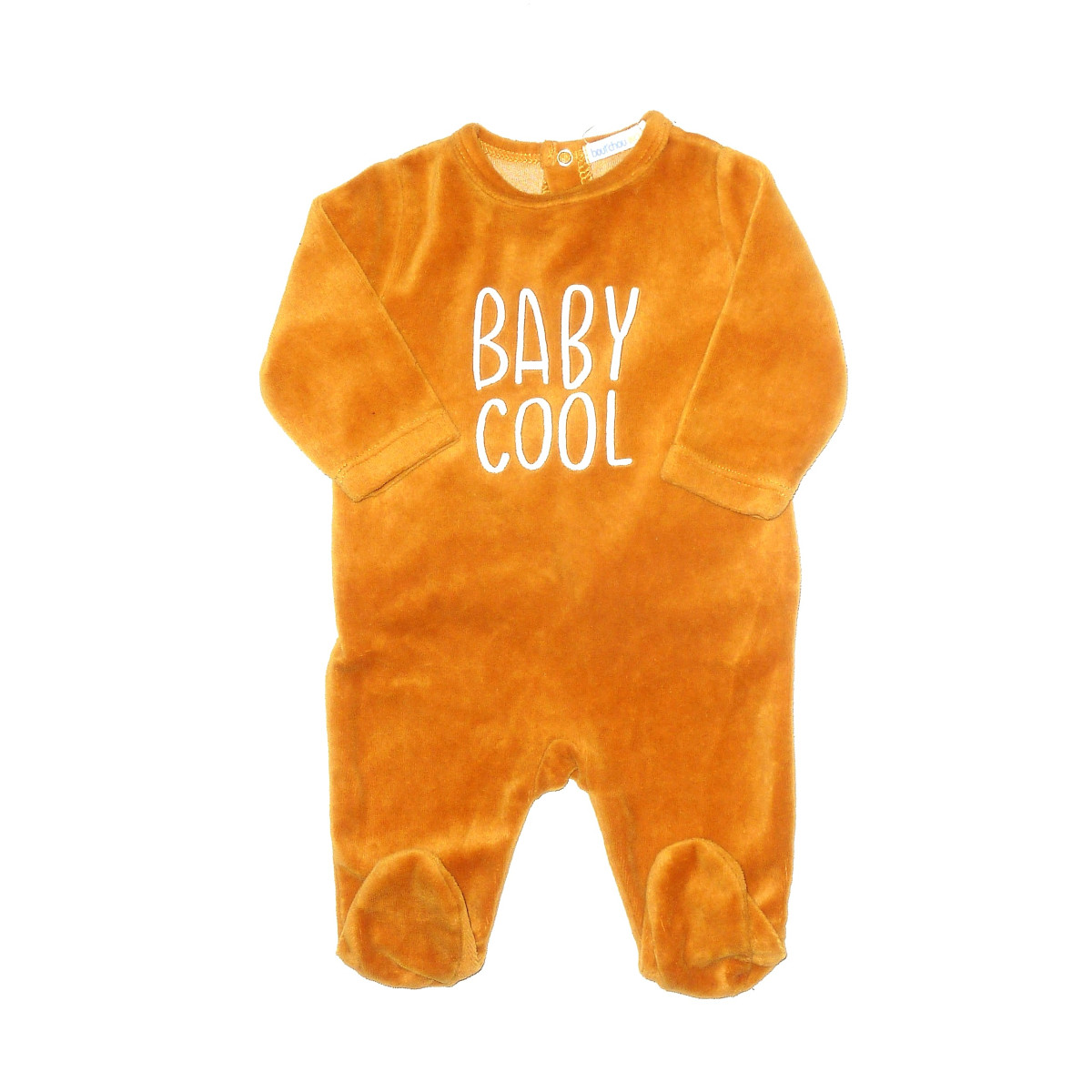 Pyjama velours en coton bio, en excellent état de marque BOUTCHOU, en velours tout doux, couleur moutarde avec une inscription.
