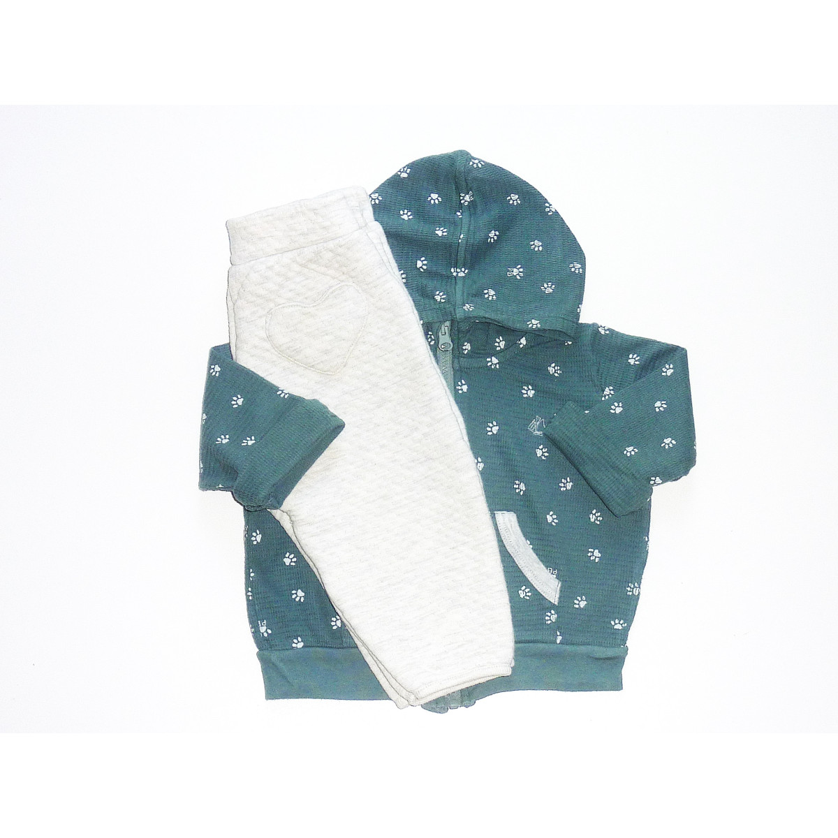 Ensemble, de marque PETIT BATEAU en état excellent, composé d'un pantalon en molleton couleur crème et du sweat imprimé crème sur fond couleur vert.