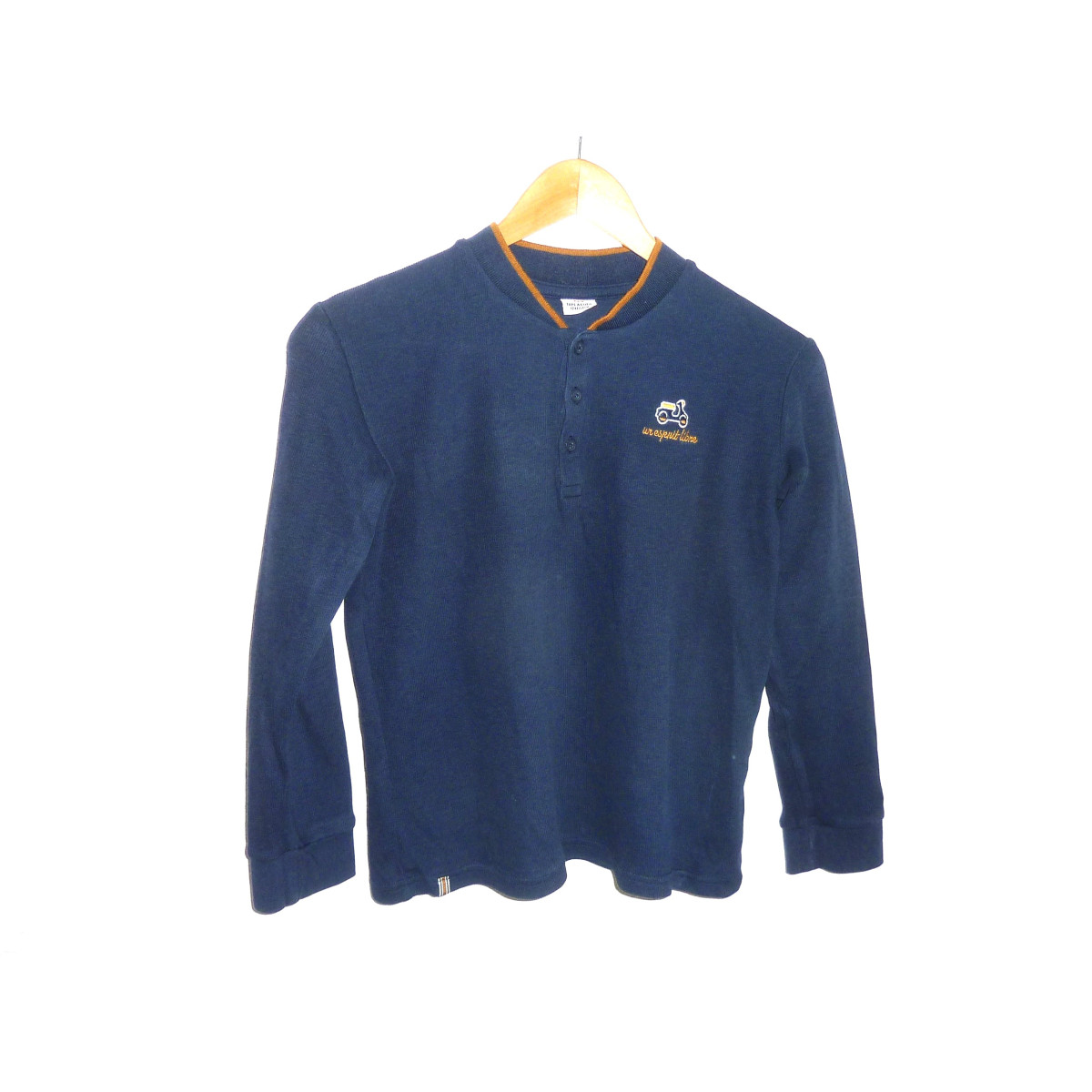 Pull de marque Tape à L'oeil, en coton côtelé marine. En excellent état. Liseré camel et encolure boutonnée.