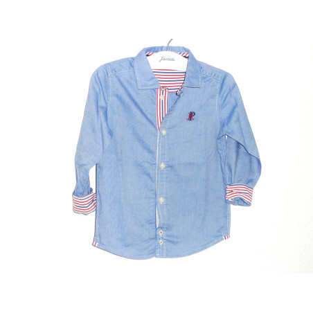 Chemise JACADI en parfait état, bleu, revers rayé rouge et bleu, insigne brodée de la marque. Un classique chic de la marque Jacadi.