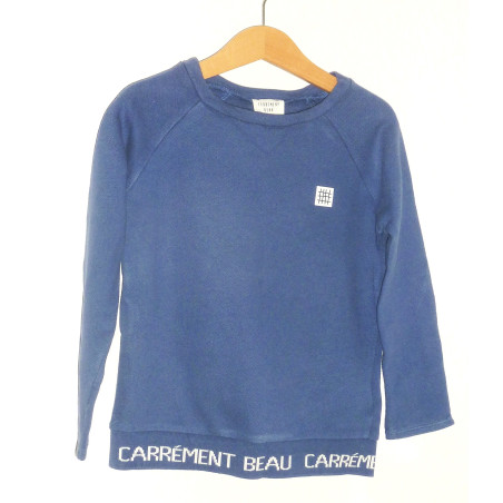Pull CARREMENT BEAU en excellent état, couleur bleu encre, 100% coton, orné de l'inscription de la marque.