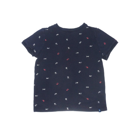 Tee shirt OKAIDI en maille piquée, en très bon état, imprimé blanc et rouge sur fond marine.