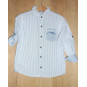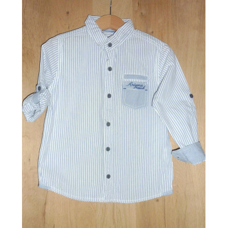 Chemise OKAIDI en parfait état, bleu pastel rayé, revers bleu aux poignets, ornée d'une petite poche et de coudières. Manches retroussables. Un classique chic de la marque Okaidi.