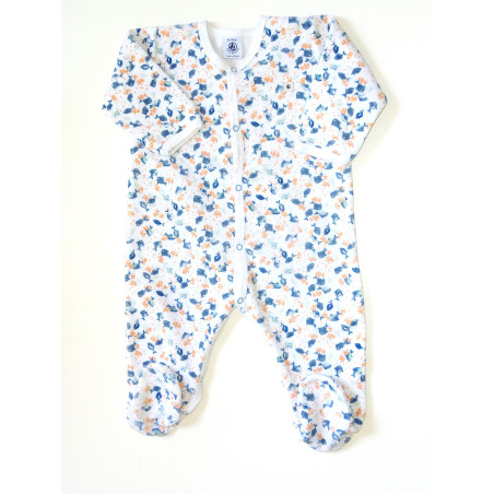 Le parfait petit pyjama pour les nuits de votre bébé. Pyjama de marque PETIT BATEAU en velours tout doux, imprimé émeraude et abricot sur fond blanc. Etat excellent.