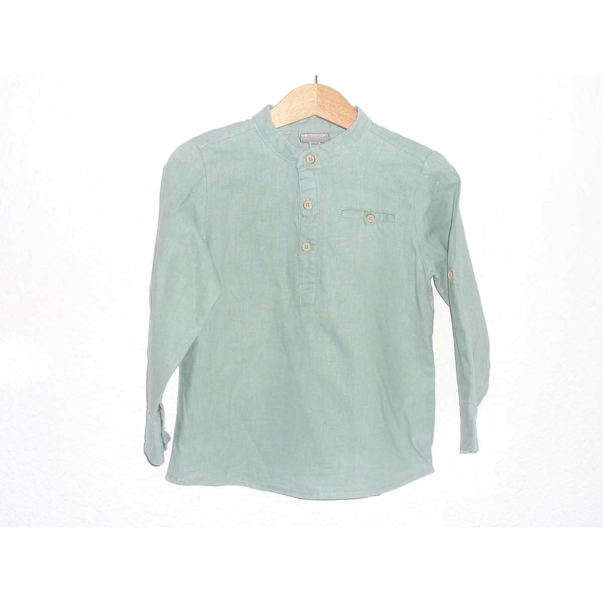Blouse en coton et lin, en excellent état, de marque VERT BAUDET. Couleur eucalyptus, col mao boutonné.
