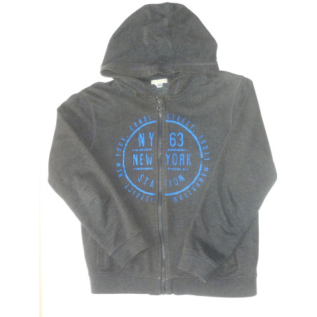 Sweat à capuche en excellent état de marque VERT BAUDET, doublé, fermeture zippée, inscription bleue sur fond couleur gris fumé.